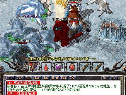 以小记51带43级法道组合在初级怒之雪原地图为例,进入时付费1元宝,可以停留30分钟。开双倍秘籍后发现这里的打怪经验非常之高。在前25分钟时间内共获得打怪经验106万,内功经验35万,这么海量的经验在别的地图可是无论如何都享受不到的。需要说明的是小记的这个角色是个技能不满且装备普通的新号,所以打怪的速度很慢,得到的经验也相对较少。如果是一个装备精良且操作熟练的玩家,那么在此升级获得的经验将是超级可观的。