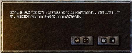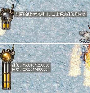进入怒之地图后,我们会在屏幕左方看到一个明显的名为“天地结晶”的显示图,在这里,每获得1点打怪经验和内功经验后,“天地结晶”便会同样增加1点打怪经验和内功经验,结晶内的经验储存到一定数量后就可以使用元宝释放,每1个元宝可以释放获得30万经验和10万内功经验。当然我们也可以选择不释放,当离开雪域地图后,“天地结晶”便会自动消失。