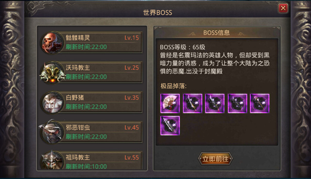 【世界BOSS】击杀世界BOSS亦是获取紫装的主要途径之一。白野猪爆靴子、邪恶钳虫爆腰带、祖玛教主爆衣服、虹魔教主爆武器,还有50级首饰、防具随机掉落。高收益对应的是高风险。每逢世界BOSS刷新,各路人马集结争夺,那叫一个腥风血雨啊。然而马克思不是说过,只要有50%的利润,资本就会铤而走险。还等什么呐!快快和小伙伴们组队刷怪吧!当然自家行会包场更是霸气全开。
