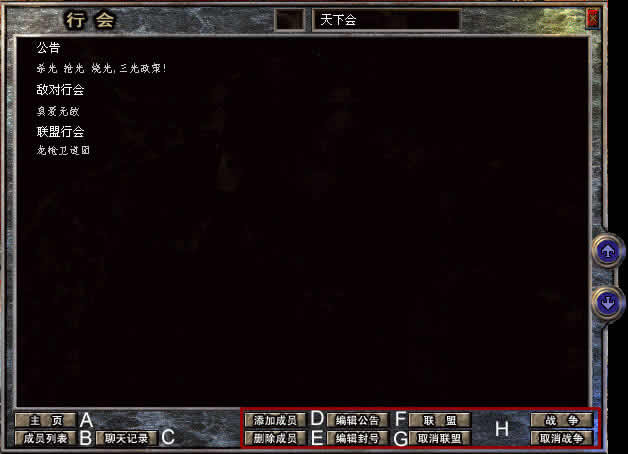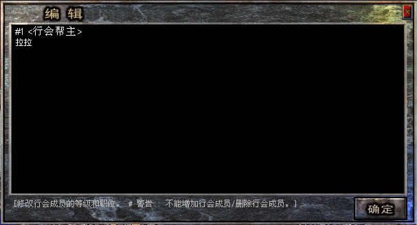 如果你这样做了,"10"下面的成员就是右护法。但是如果位置 "10" 没有行会的成员,就会产生错误。 ---------------------------------------------------------------------- 如果你想彻底的删除行会,你应该在清除所有行会的成员和成员称号位置后删除行会领袖。 ---------------------------------------------------------- 如果想继承行会领袖,首先, 把继任者放到领袖列表的下面。接着应该把现在的领袖移动到别的位置。